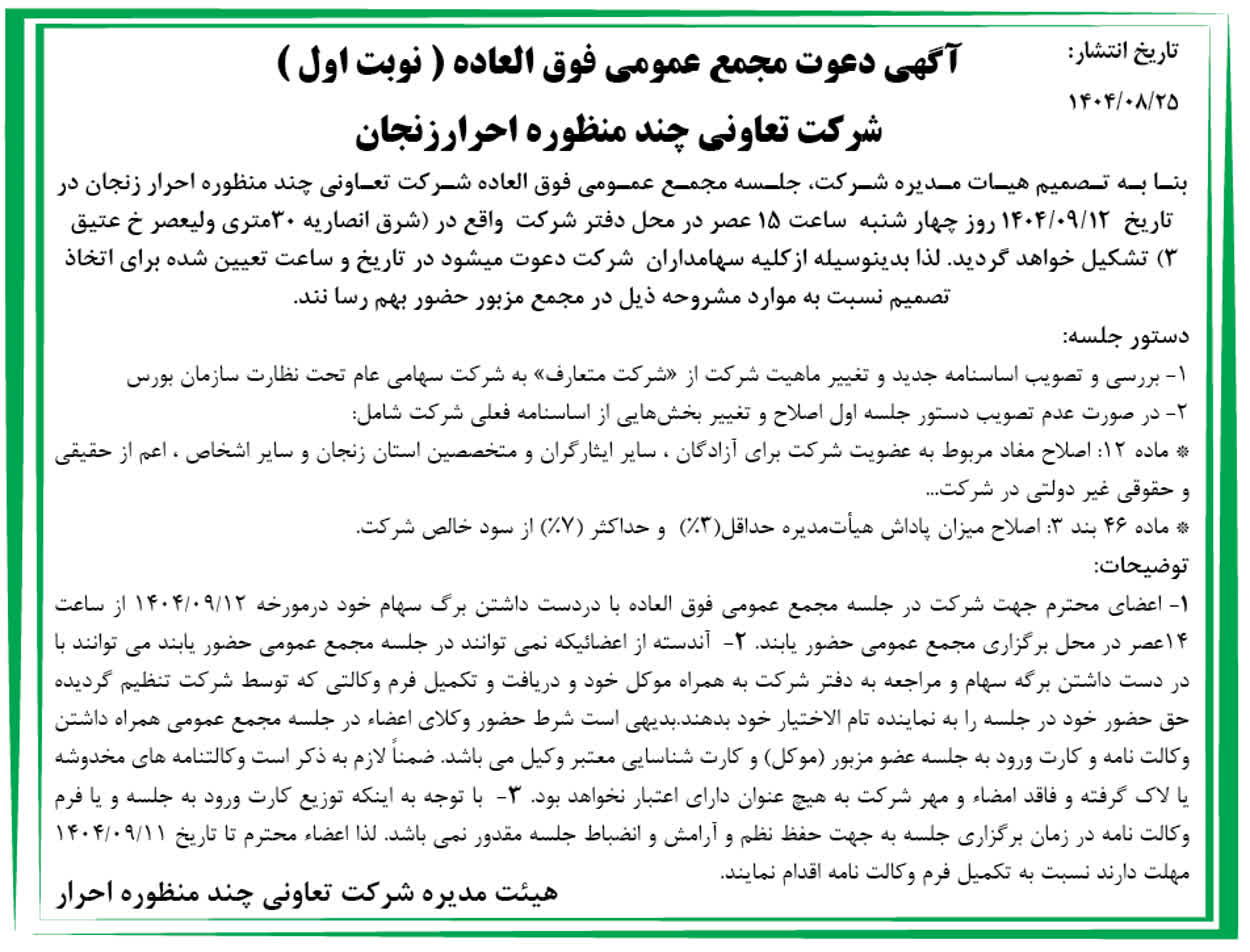 آگهی دعوت مجمع عمومی فوق العاده(نوبت اول ) روزچهارشنبه 1404.09.12ساعت 15عصر در محل دفتر شرکت زنجان واقع در شرق انصاریه 30 متری ولیعصر خ عتیق 3 قطعه 7295 تشکیل خواهد گردید .