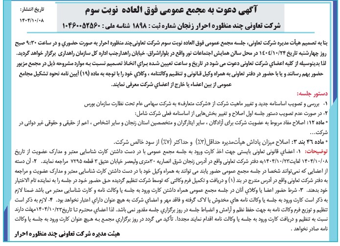 باسلام؛احتراماً بدینوسیله از کلیه سهامداران محترم دعوت به عمل میآید در مجمع عمومی فوقالعاده شرکت احرار که در روز چهارشنبه مورخ ۱۴۰۴/۱۰/۲۴ ساعت ۹:۳۰ صبح در سالن نور (آدرس : خیابان اشراق-خیابان راهداری-پشت شهر بازی)برگزار میشود، حضور بههم رسانند.با تشکر.شرکت احرار زنجان