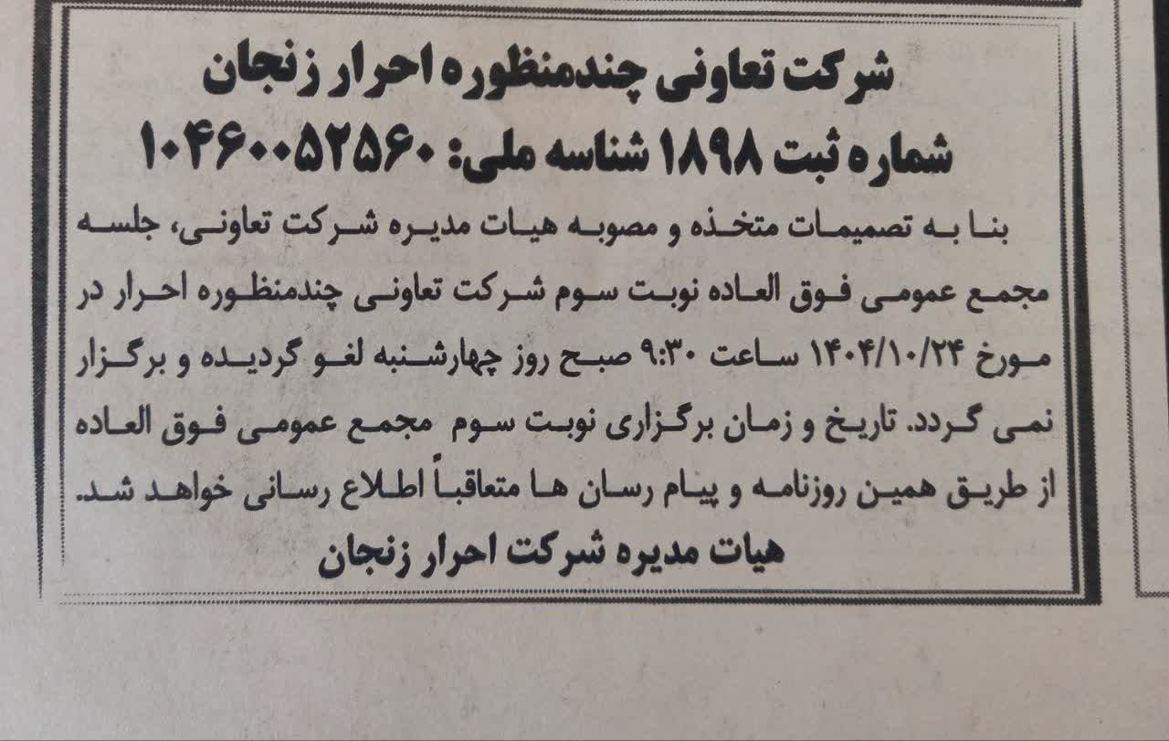 آگهی دعوت به مجمع عمومی فوق العاده نوبت دوم شرکت تعاونی چند منظوره احرار زنجان